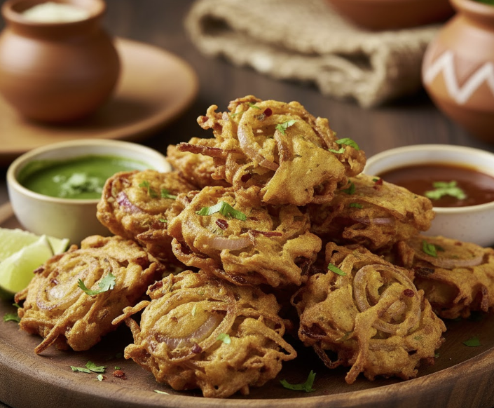 Pollo pakora, cebolla bhaji, pollo tikka y verdura pakora.