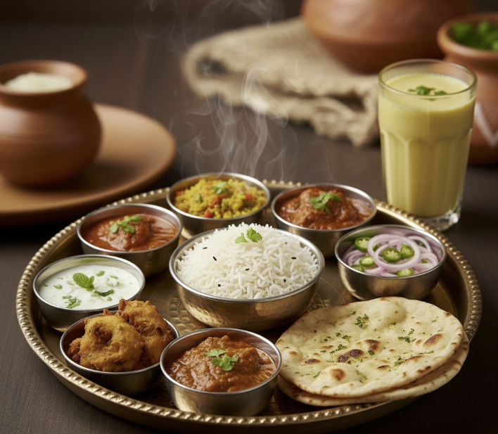Curry veggie, curry pollo, raita, arroz pilaw, arroz basmati, ensalada de cebolla, pan naa y mango lassi