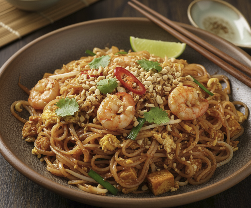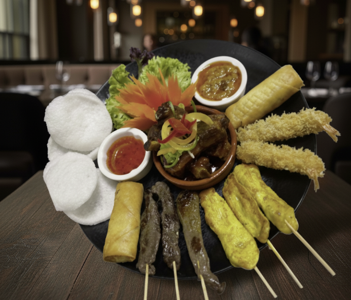 Con curry verde y leche de coco, verduras salteadas y salsa saté.