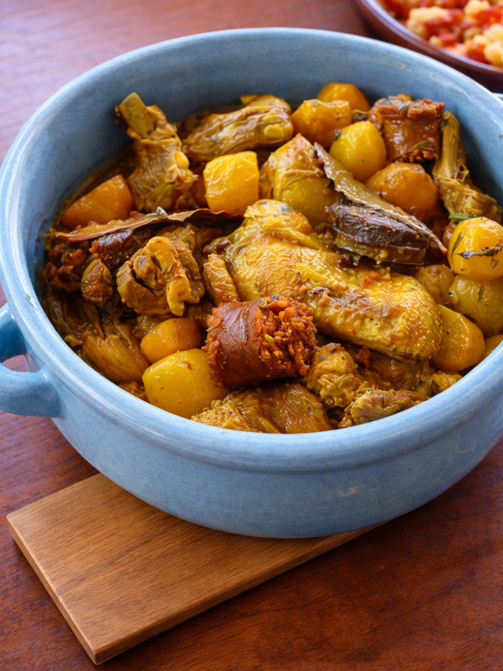 Este es uno de los platos más queridos y con más tradición en el interior de la isla. Originalmente se preparaba el día de la matanza del cerdo, pero su popularidad ha hecho que se disfrute durante todo el año. Es un arroz caldoso y contundente que combina carne de cerdo, pollo, níscalos (setas) y especias locales.